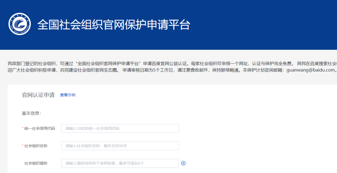 通过上述方式进入全国社会组织官网保护申请平台,输入机构的基本信息、认证信息等提交申请,相关申请将在5个工作日内完成审核。