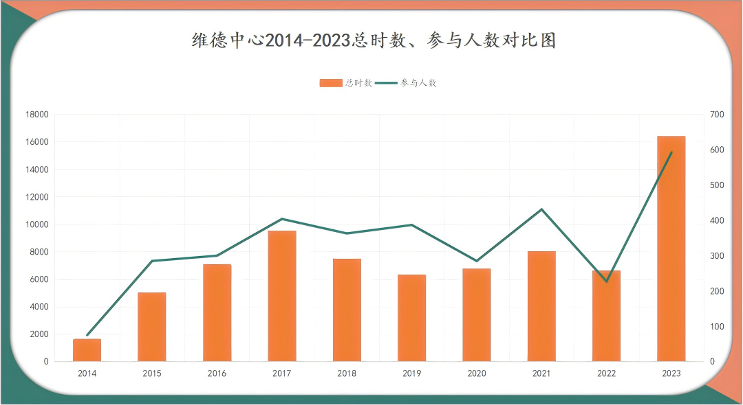 在2023年,维德法律服务平台共有592位法律专业志愿者(其中568位为律师或实习律师,来自149家律师事务所)为社会贡献志愿法律服务时数共计16349.7小时,是2022年度的2.5倍,志愿服务人数同比增长160.8%,志愿服务时数同比增长149.4%,无论参与志愿者的人数还是志愿服务的时数均创维德十年最高。