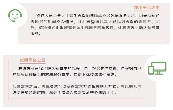 从平台初步建成到成为维德开展志愿法律服务的主要工具,并大幅度提升服务成效,维德的志愿法律服务数字化之路走上了正轨。在这个历程中,维德和全思科技通过不断地打磨尝试,才逐步实现了最符合项目需要的公益数字化平台。