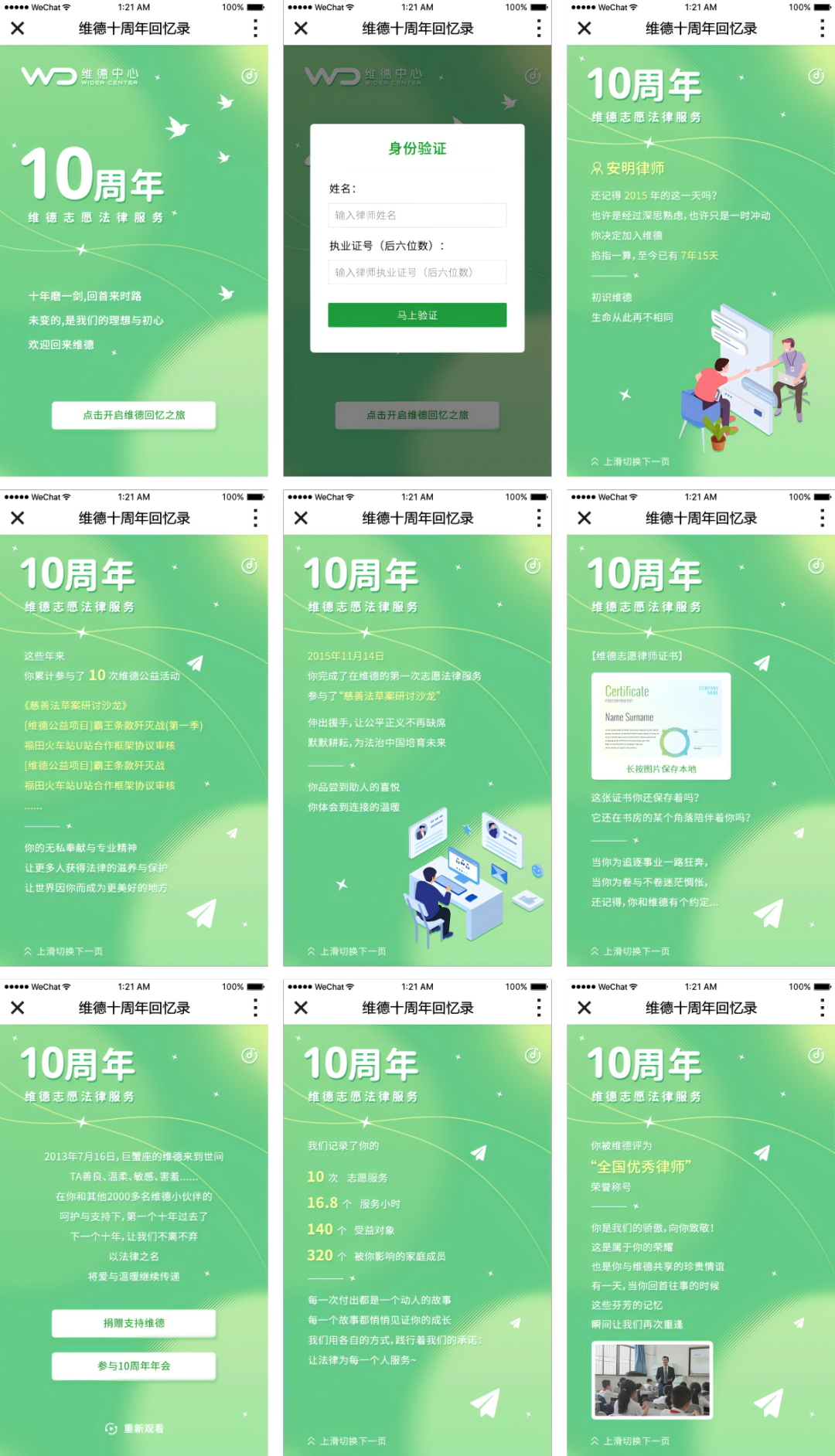 - 为增加律师志愿者对机构的认同感,设计实现志愿服务十周年H5专题页